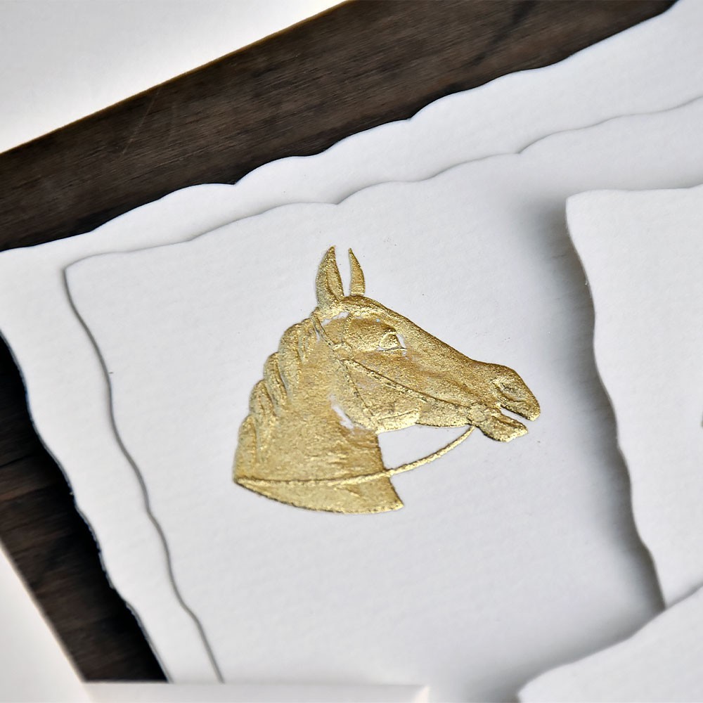 Laid paper is a mat paper with a weft composed of thin parallel lines. It is suitable for all types of pens, including fountain pens. These elegant vintage notecards are embossed by hand in France. This embossing is achieved by placing the paper between an etched die and its sunken counterpart and exercising pressure. This elaborate technique provides a great precision in the raised effect and the colors.